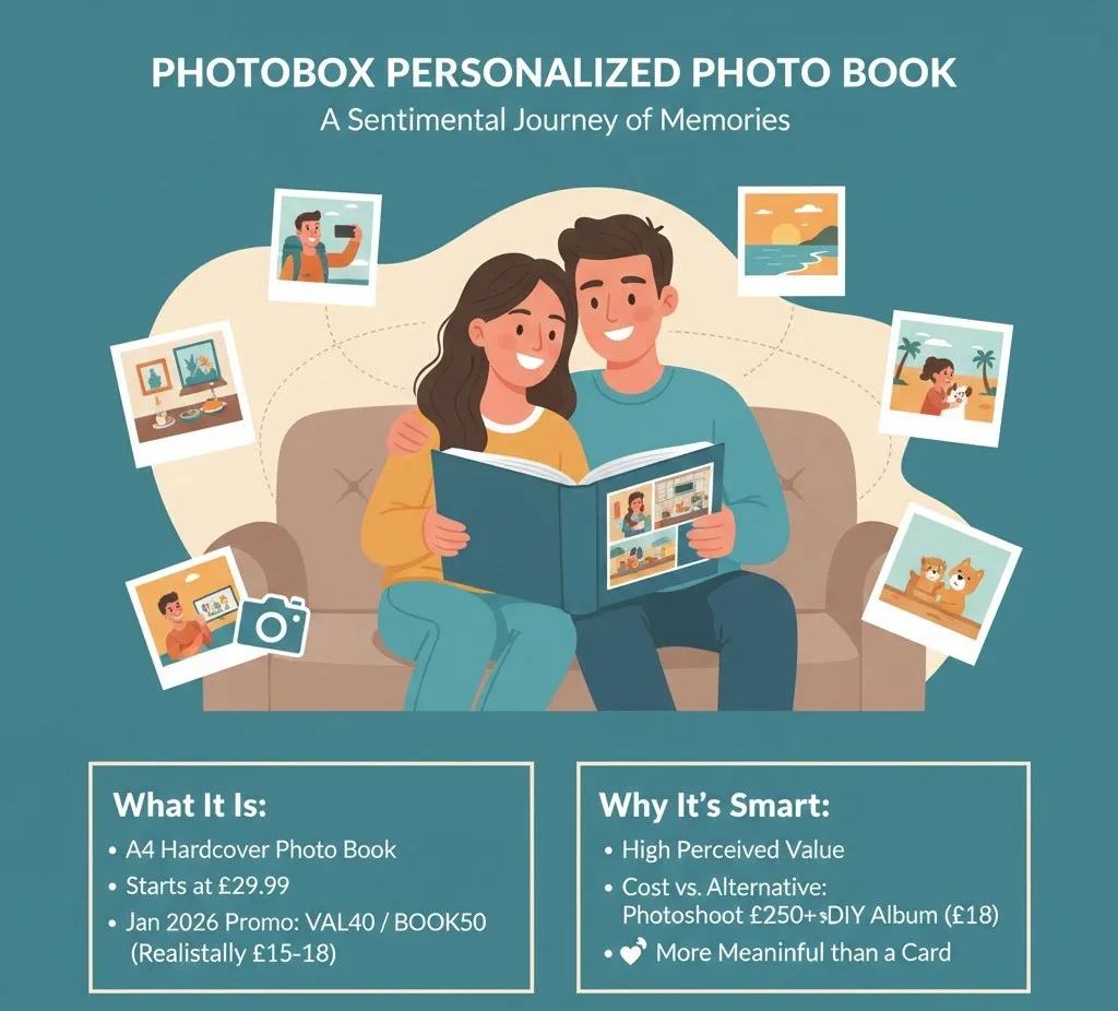 Why It’s Smart: A “traditional” framed photo and a luxury Valentine’s card will cost you £25+. For £18, you are giving her a 20-page book that took effort to curate. The perceived value is much higher than the actual cost.