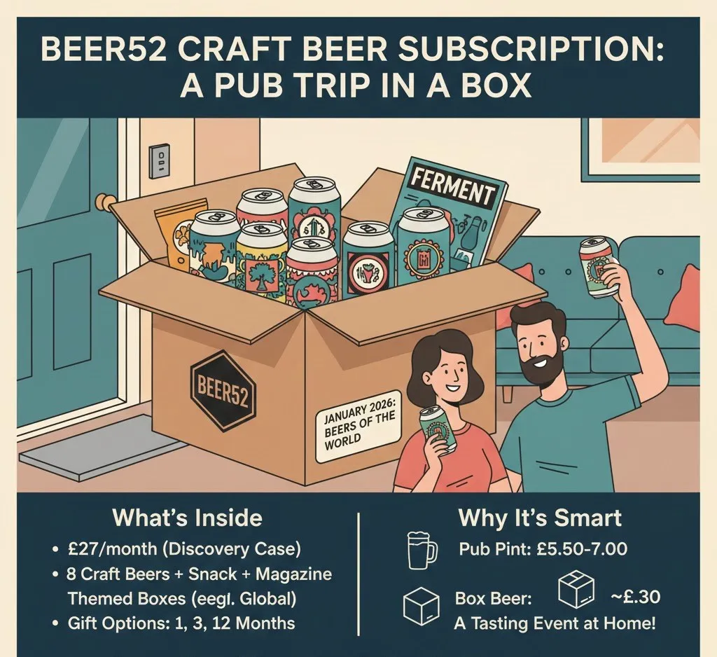 | Beer52 Subscription | £27.00 / box | 8 independent beers + snacks; cheaper than a pub round. |