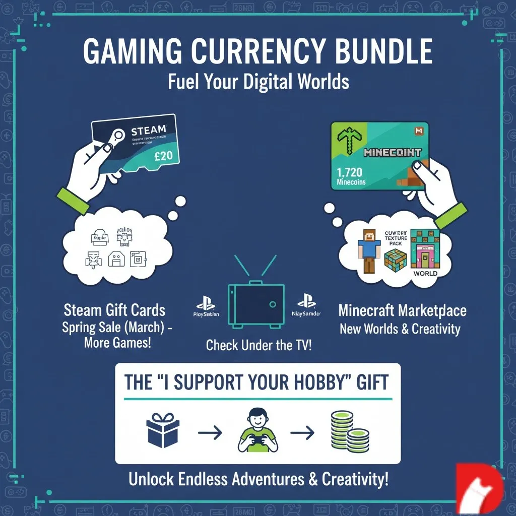- The “Gamer” Pack: £20 Steam Card + £12.99 Game Pass + Minecoins gift card = £41.38. This covers his PC, his console, and his Minecraft builds.