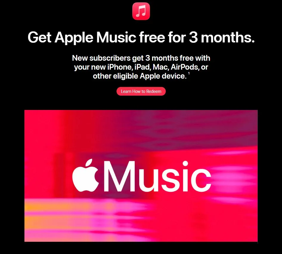 Buy a new iPhone, iPad, Mac, AirPods, HomePod, or Apple Watch and you get three months of Apple Music on the house. No code required. Just open the Apple Music app on your new device after setup and the offer pops up automatically.