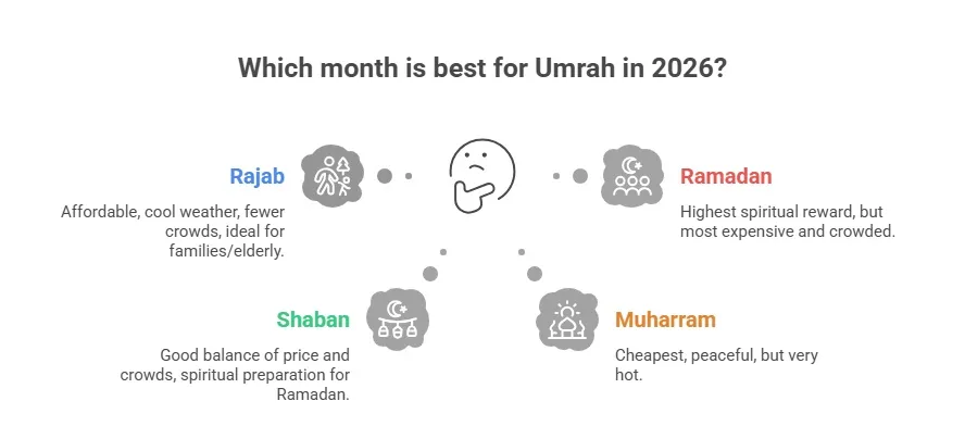 - Book early for Ramadan, be flexible for off-peak. The difference between booking Ramadan in October versus January is £800-1,000 per person. For Muharram or Rajab, you have more breathing room.
