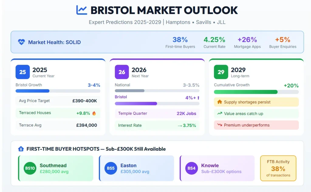 Bristol’s market fundamentals remain solid despite national uncertainty. Demand continues exceeding supply, first-time buyers represent 38% of transactions, and rate cuts to 4.25% have improved affordability from 2023 lows.