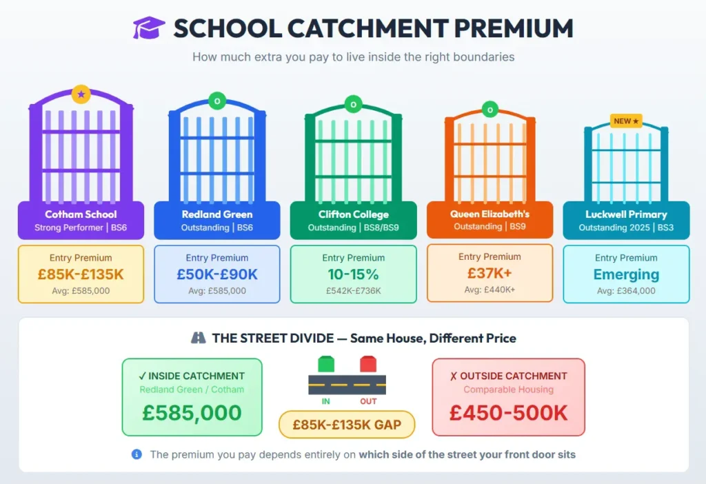 This is where Bristol gets expensive quickly. Properties inside the catchment for Redland Green School or Cotham School carry premiums that would make London estate agents raise eyebrows.