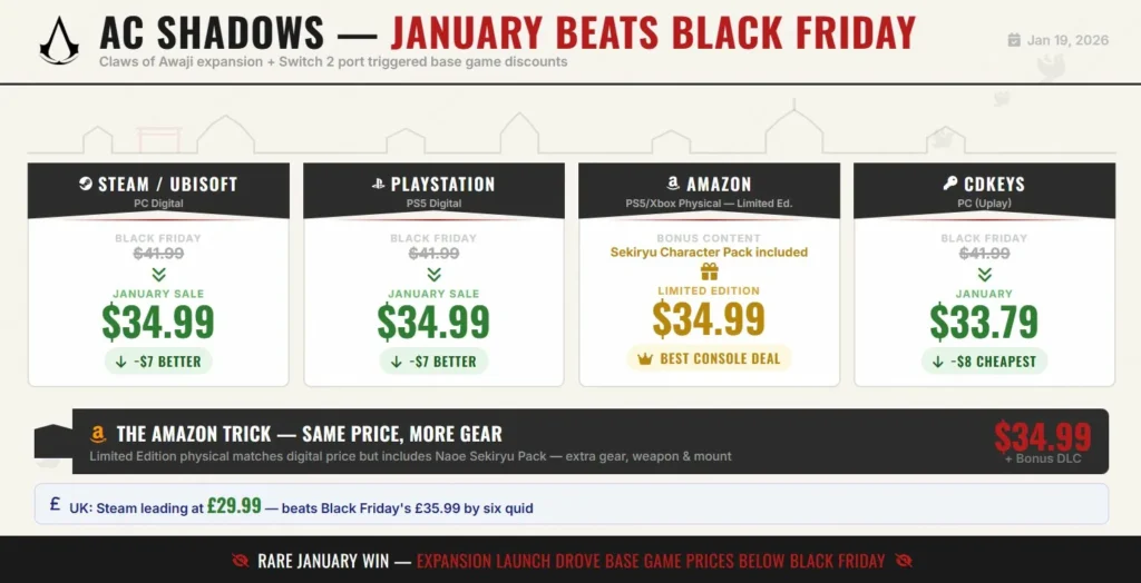 The Amazon trick: The Limited Edition physical copy is currently $34.99 on Amazon, which matches the digital price but includes the Naoe Sekiryu Character Pack (extra gear, weapon, and mount). If you’re buying on console, the Amazon version gives you more for the same money.