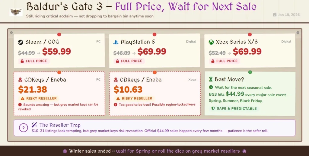 When to buy: Steam runs a Lunar New Year Sale in late January or early February every year. Baldur’s Gate 3 will almost certainly drop back to $44.99 during that event. If you can wait three to four weeks, you’ll save fifteen quid.