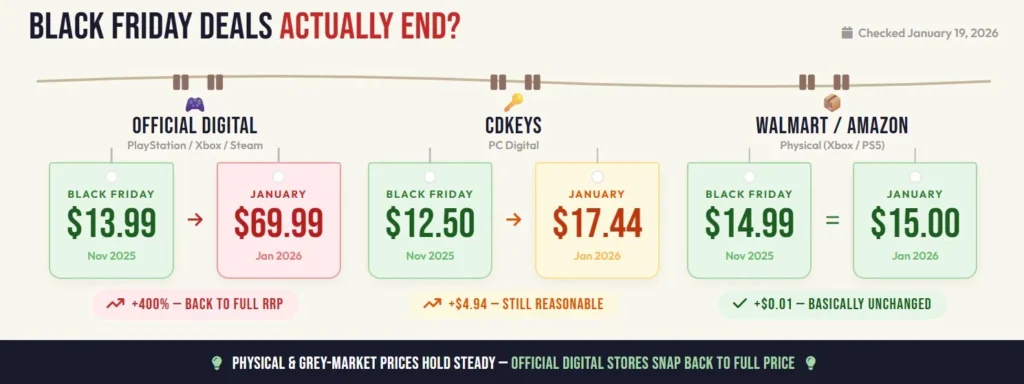 Turns out, reality’s messier than that. We tracked seven major titles from Black Friday 2025 through to mid-January 2026 to see what’s actually changed. Some games got cheaper. Some went back up. A couple are sitting at exactly the same price they were in November, but nobody’s talking about it because there’s no marketing push.