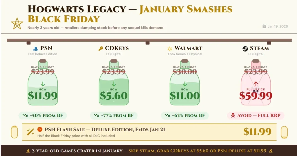 This is where it gets interesting. Hogwarts Legacy came out in February 2023, so by January 2026 it’s nearly three years old. Retailers are desperate to shift the last of the stock before any sequel announcement kills demand entirely.