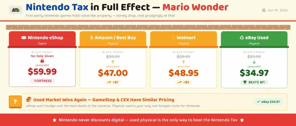 Digital storefronts: They return to full RRP when winter sales finish. You’re waiting until the next major sale (Lunar New Year, Easter, Spring Sale) on a digital if you missed it for Black Friday.