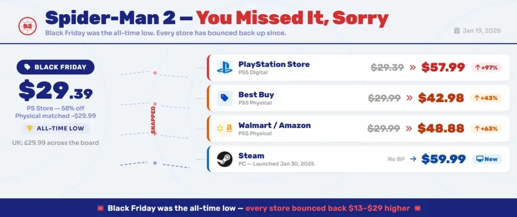 This one hurts. Marvel’s Spider-Man 2 had a proper bargain during Black Friday 2025, and if you didn’t grab it then, you’re paying more now. Simple as.