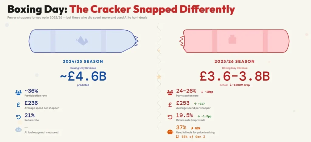 The drop from 36% to 24-26% participation is significant—roughly a third fewer people bothering with Boxing Day sales. But those who did participate spent £17 more on average, suggesting intentional purchases rather than browsing that turned into buying.