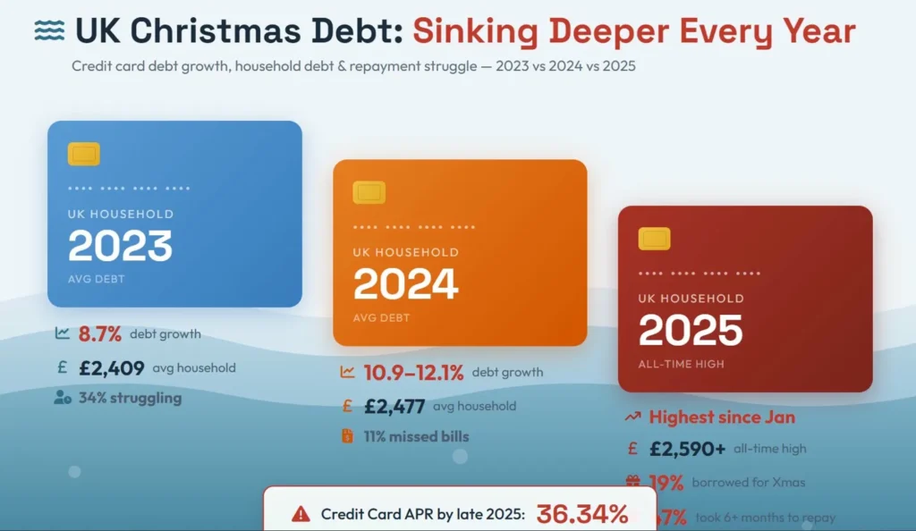 The 2025 figure of 19% borrowing specifically for Christmas spending represents nearly one in five households going into debt for presents and food. And with credit card APRs hitting 36.34% by late 2025, that borrowed money costs considerably more to pay back than it did even two years earlier.