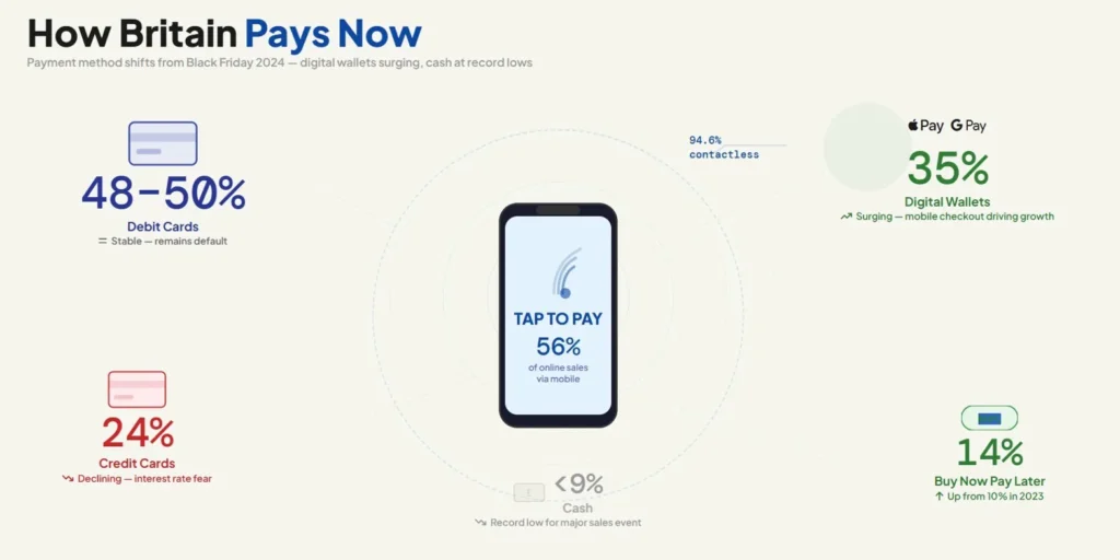 Contactless hit 94.6% of all eligible in-store card transactions. The mobile dominance (56% of online sales) directly fuelled digital wallet adoption because typing card numbers on phone screens is friction nobody wants.