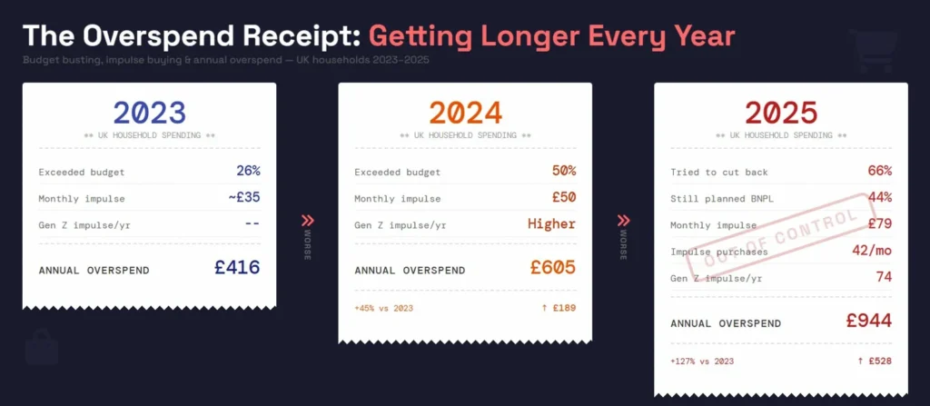 The average overspend more than doubled from £416 to £944 annually across the period. Gen Z drove much of this, averaging 74 impulse purchases per year in 2025—nearly double older demographics.