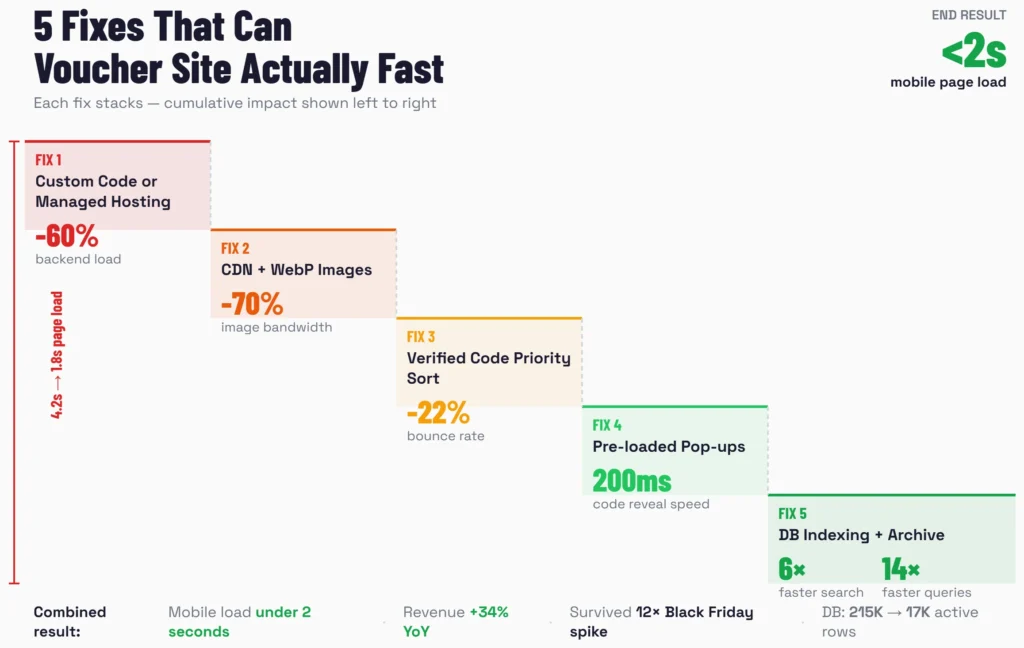 Our UK voucher site loads in under 2 seconds on mobile now. Users find working codes faster. Bounce rate is down. Affiliate click-through rate is up. Revenue increased 34% year-over-year, and about half of that came directly from speed improvements.