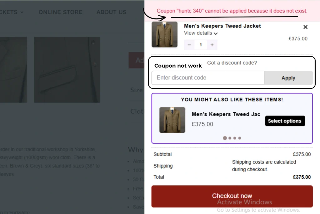 The code “huntc 340” contains a space between “huntc” and “340”. Real coupon codes never have spaces. E-commerce systems require continuous strings like “huntc340” or “HUNTC340”. A code with a space will either fail at checkout or cause errors. This basic mistake exposes the scam.