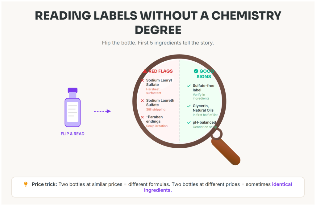 Flip the bottle over. First five ingredients tell most of the story — formulas list by concentration.