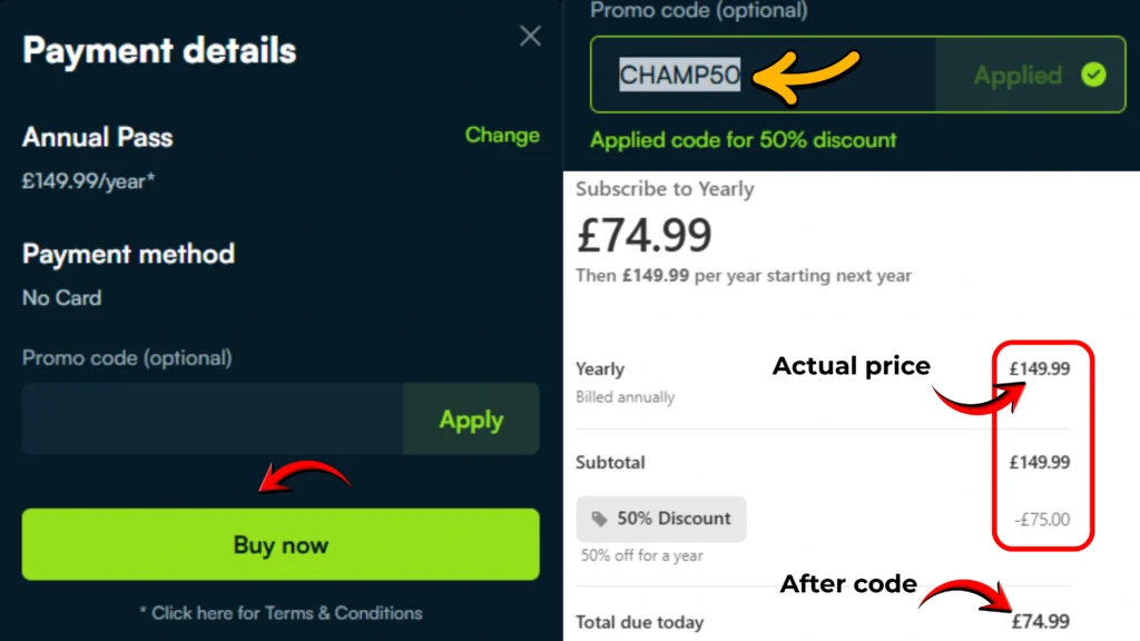 - Enter Code CHAMP50 at checkout