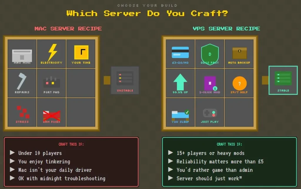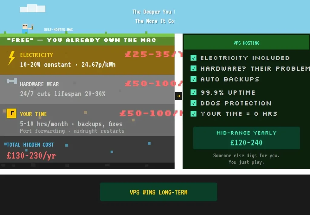 Your time — This one gets ignored until it bites you. Setup, backups, restarts, troubleshooting when someone can’t connect, port forwarding headaches, dynamic IP drama. Call it 5-10 hours per month if you’re being honest. Value your time at even £10 an hour and that’s £50-100 monthly in labour you’re donating to the cause.