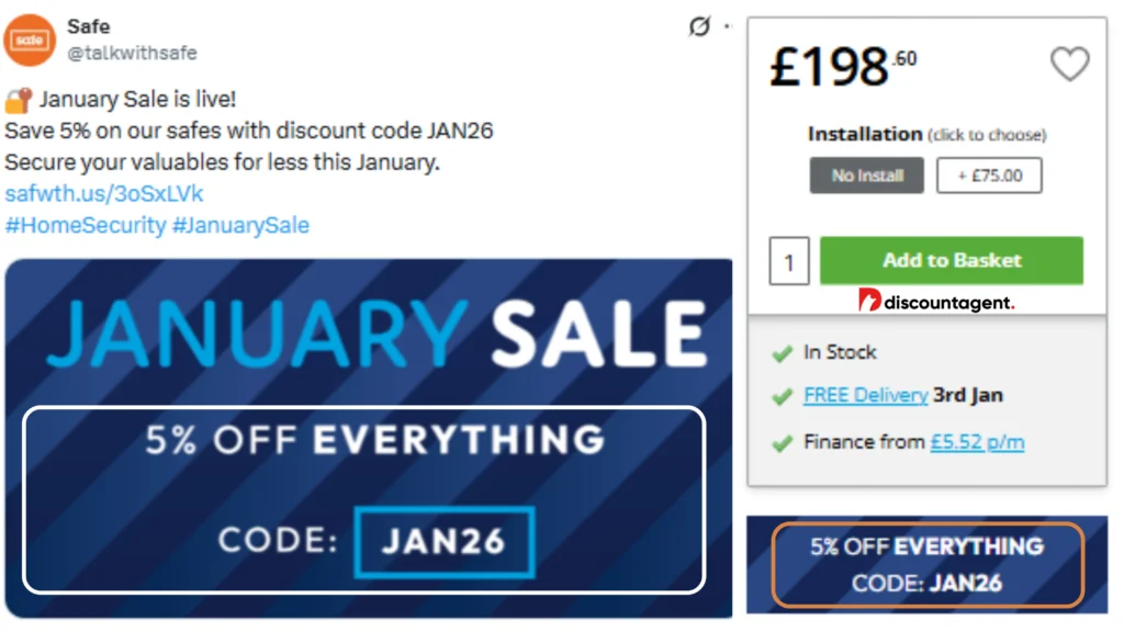 Code: JAN26 Discount: 5% off everything Sale ends: Midnight, 1st February 2026 Shop safe.co.uk.