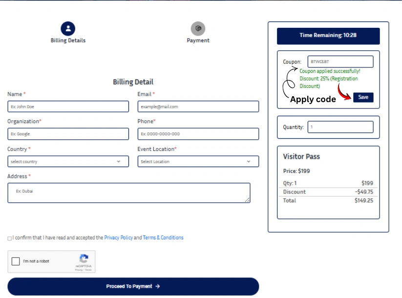 - Select your ticket type – Speaker, Delegate, Business, or Visitor