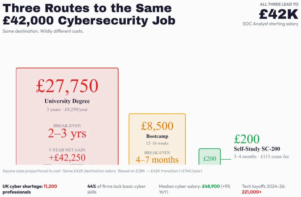 Over five years, that’s £70,000 in additional earnings minus £200 in costs. Compare that to the bootcamp graduate who spent £8,500 for the same £42,000 job — they’re £8,300 behind before they’ve even started.