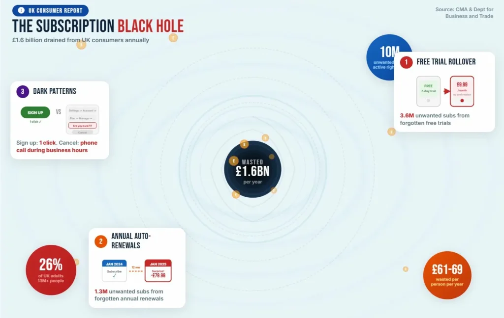 According to the Department for Business and Trade and the Competition and Markets Authority, UK consumers waste £1.6 billion per year on unwanted subscriptions. Not “subscriptions we don’t like anymore” – subscriptions we genuinely don’t want and forgot we had.