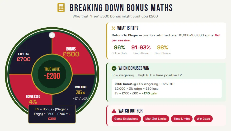 The expected value (EV) formula reveals the true cost: EV = Bonus Amount – (Total Wagering Requirement × House Edge). House edge is the casino’s built-in advantage, expressed as a percentage. On a slot with 96% RTP (return to player), the house edge is 4%. Applying it: £17,500 × 0.04 = £700 expected loss. Subtract from the bonus: £500 – £700 = -£200. The offer leaves you worse off on average.