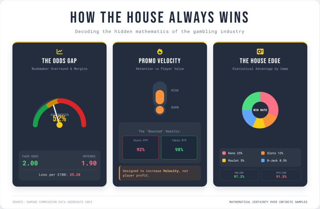 Wagering requirements lock in this. A bonus might seem generous, but multiplying the edge by required bets guarantees casino gains. Only low edges plus minimal wagering shift odds player-side. UK rules mandate RTP display on machines, aiding transparency (UK Gambling Commission, Return to player – how much gaming machines payout, 2021).