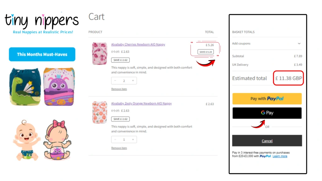 Visit Tiny Nippers at tinynippers.co.uk. Browse their full range and find everything you need for your family. Add your selected items to the basket. No discount code needed, the 50 per cent discount applies automatically at checkout. Simple as that.