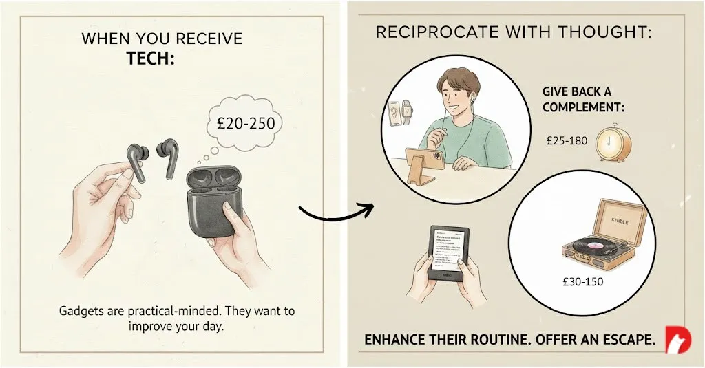 Wireless earbuds if they commute (Sony, Jabra, Samsung: £80-180). A quality phone stand if they video call (£25-50). A sunrise alarm clock if they struggle with mornings (Lumie: £50-100).