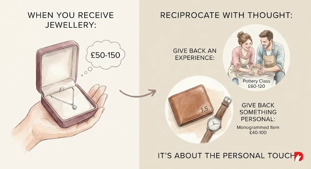 Budget matching: don’t respond to a necklace with a novelty keyring. Stay within the same tier.