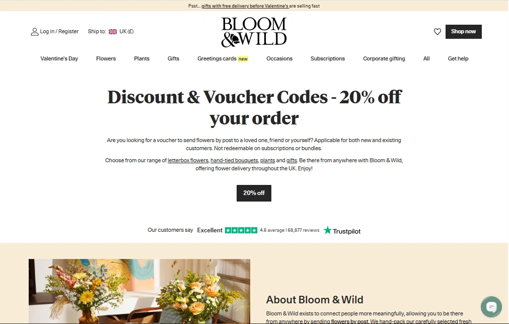 The Offer: Bloom & Wild publish a permanent discount code directly on their official website at bloomandwild.com/discount-code, offer 20% off flower, plants and gifts for both new and existing customer.