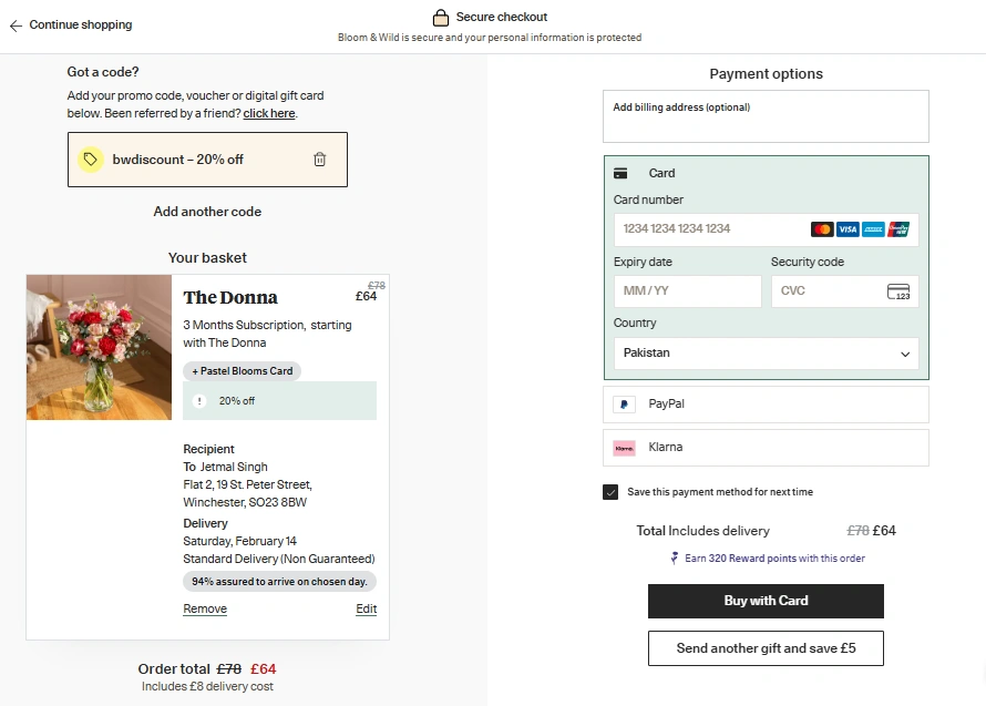 - Complete Payment β Enter your card details (Visa, Mastercard, Amex, PayPal, Apple Pay, Google Pay, or Klarna are all accepted) and click “Place Order”. Your Valentine’s flowers are on their way.