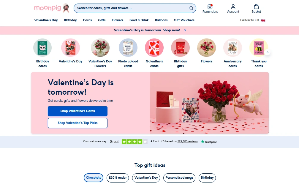 - Visit Moonpig β Go to www.moonpig.com/uk. Navigate to the Valentine’s Day Cards section.