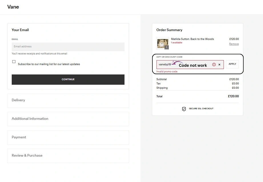 This is the biggest and most obvious red flag. The entire message revolve around a “special 19% OFF coupon,” but when you actually try to apply the code vanebp19 at checkout, it simply doesn’t work.