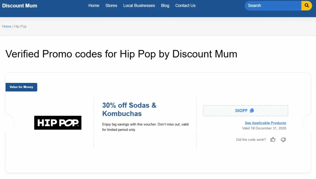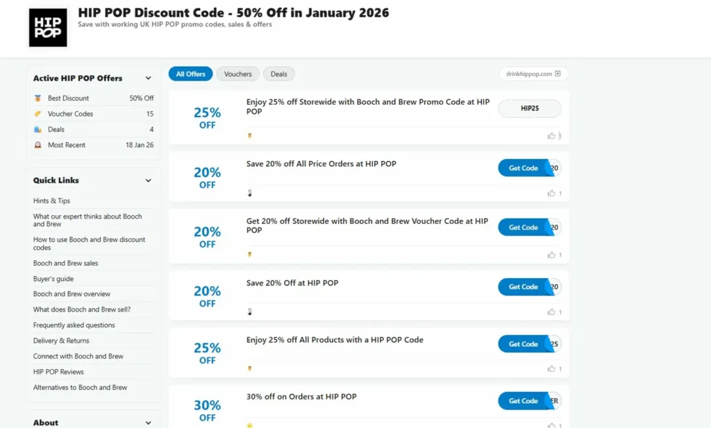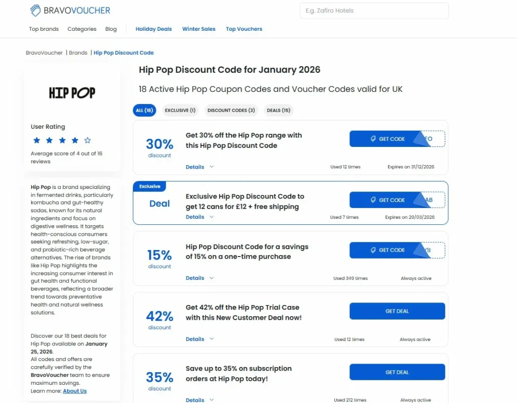 BravoVoucher takes a different approach — they bundle loads of context around their listings. The Hip Pop page showed 18 active codes and deals when I checked, ranging from the standard 30% off down to specific offers like “12 cans for £12 + free shipping” and “42% off the Trial Case.”
