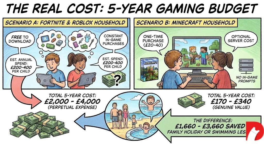 Both games cost nothing to download. Both games feature constant prompts to purchase cosmetics, currency, and passes. Conservative estimates put annual spending at £200-400 per child. Multiply by two children over five years and the total hits £2,000-4,000.