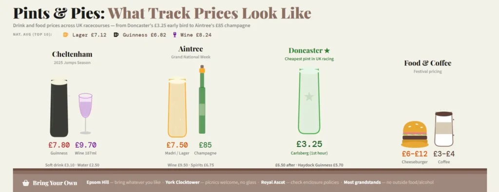 Doncaster offers the cheapest on-course pint in UK racing according to the Racing Post’s 2025 Price Index–Carlsberg at £3.25 during the first hour after gates open, £6.50 thereafter. Haydock does Guinness at £5.70.