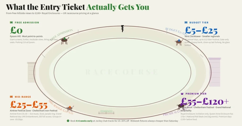 - Premium tier (£55–£120+): Royal Ascot, Cheltenham Festival, Grand National hospitality.